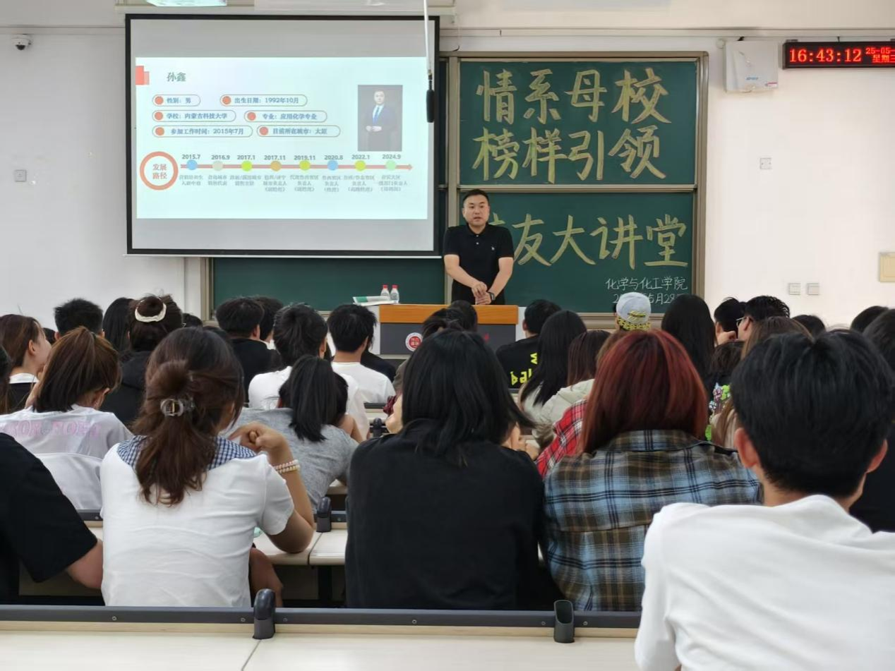 为充分发挥优秀校友对在校学子的榜样引领作用,beat365官网于5月28日在明德楼H110成功举办“情系母校,榜样引领”校友大讲堂活动。本次活动特邀2015届应用化学专业优秀校友孙鑫重返母校,倾情分享其职业历程与成长感悟。活动由学院党委副书记副院长主持,百余名学生参加。